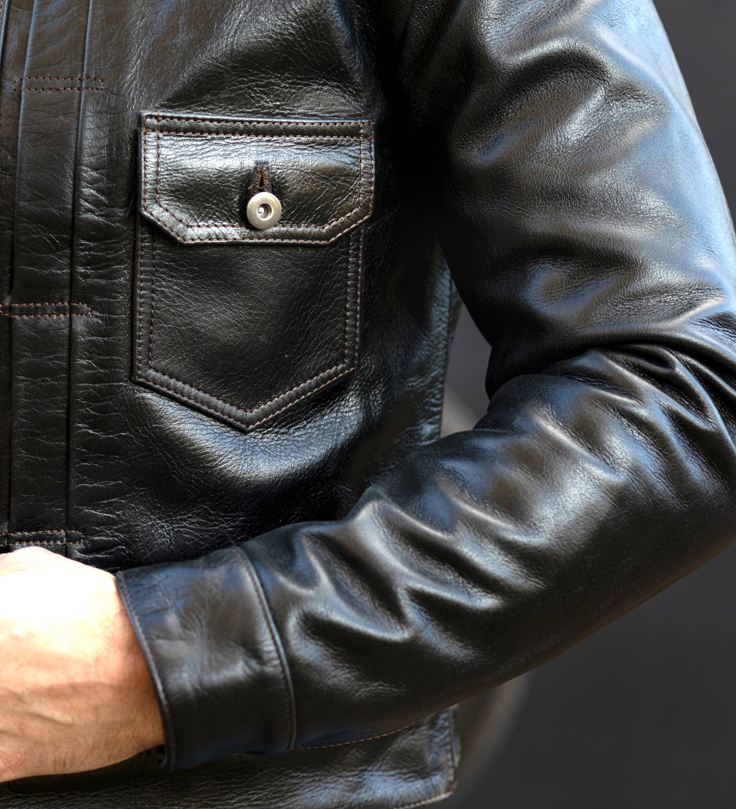 Crafted from European hides, our Teacore Black steerhide measures in at 1.5 mm (3.5 oz) and features a glossy semi-aniline finish. Beneath its deep black surface lies a rich brown core, achieved by layering black pigment over naturally dyed brown hide. As the leather breaks in, years of wear gradually reveal the warm undertones beneath, creating a dynamic two-tone patina.