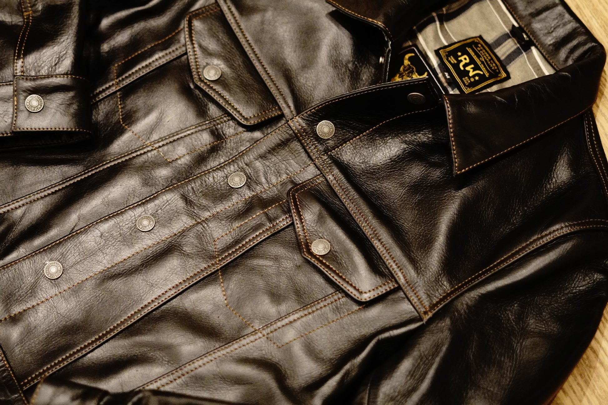 Here she is in her final form, as smooth as a glass of whiskey. After scouring through dozens of hides, we were able to source a hide that would not only look great fresh out of the box but even better as it develops the unique wearing pattern of its owner. For this, we decided to go with Oil Black Bison. Tobacco stitching runs throughout, while the jacket is contrasted with a tartan lining and fasteners with our signature antique nickel snaps.